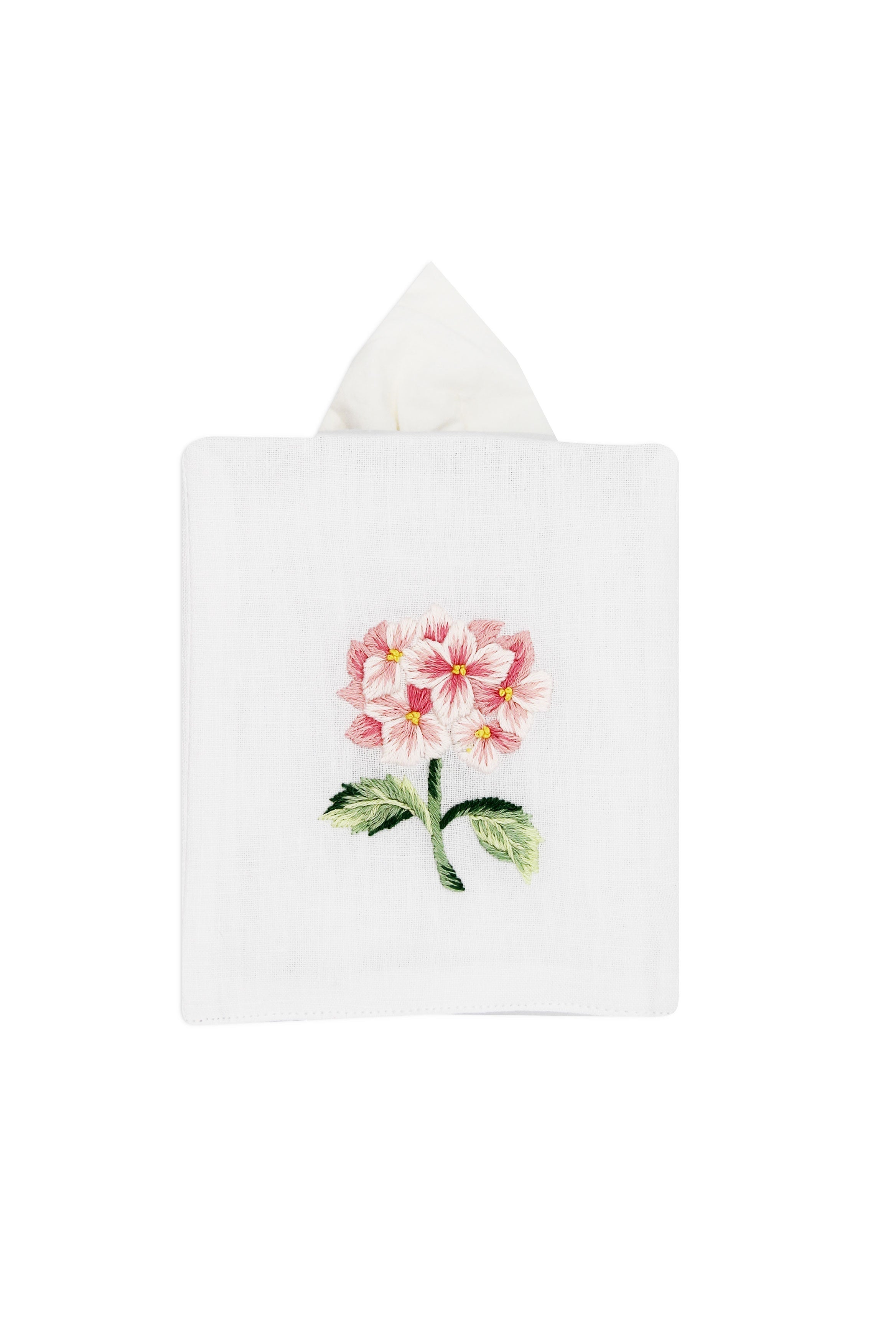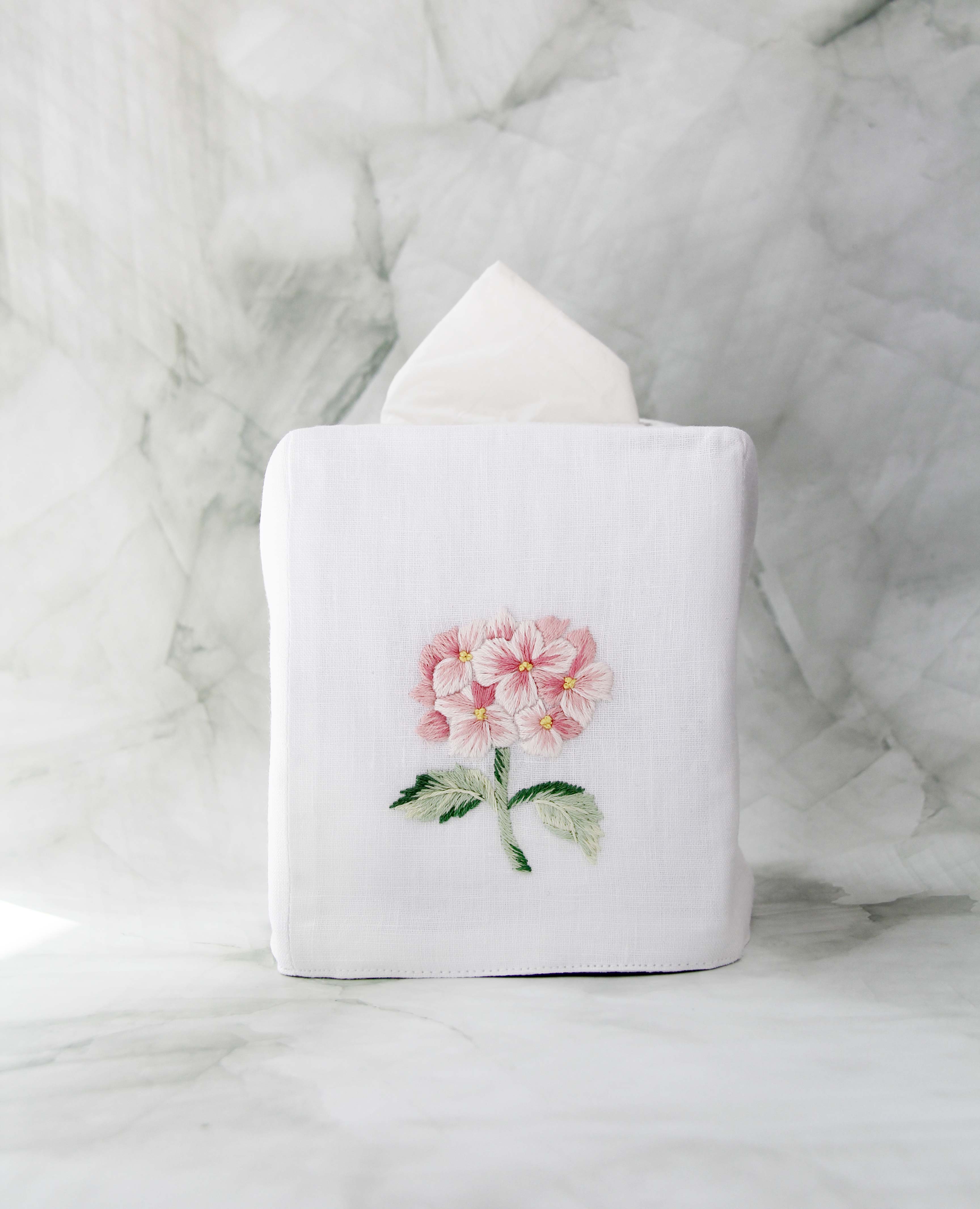Housse de boîte de mouchoirs carrée brodée lin Hortensia rose