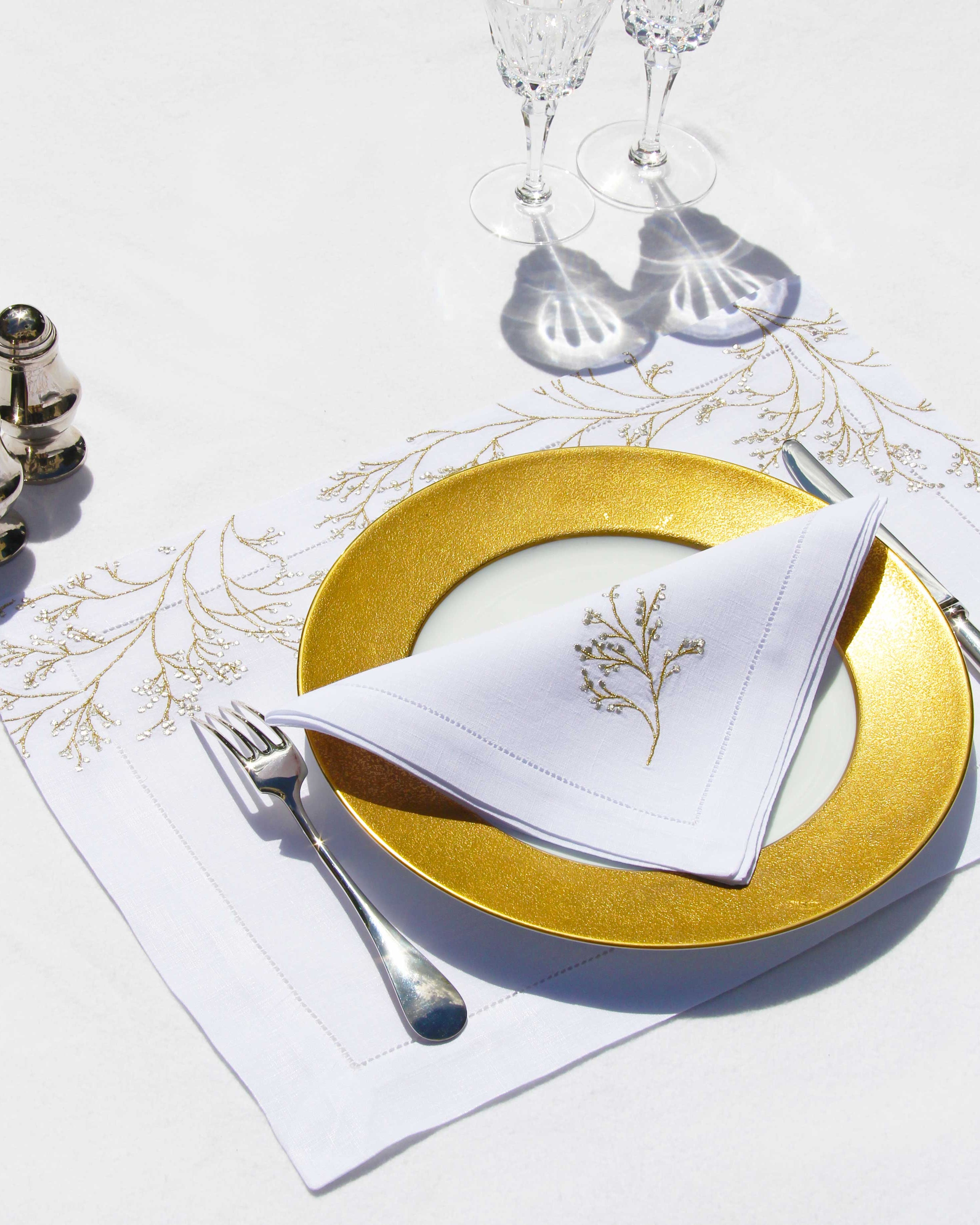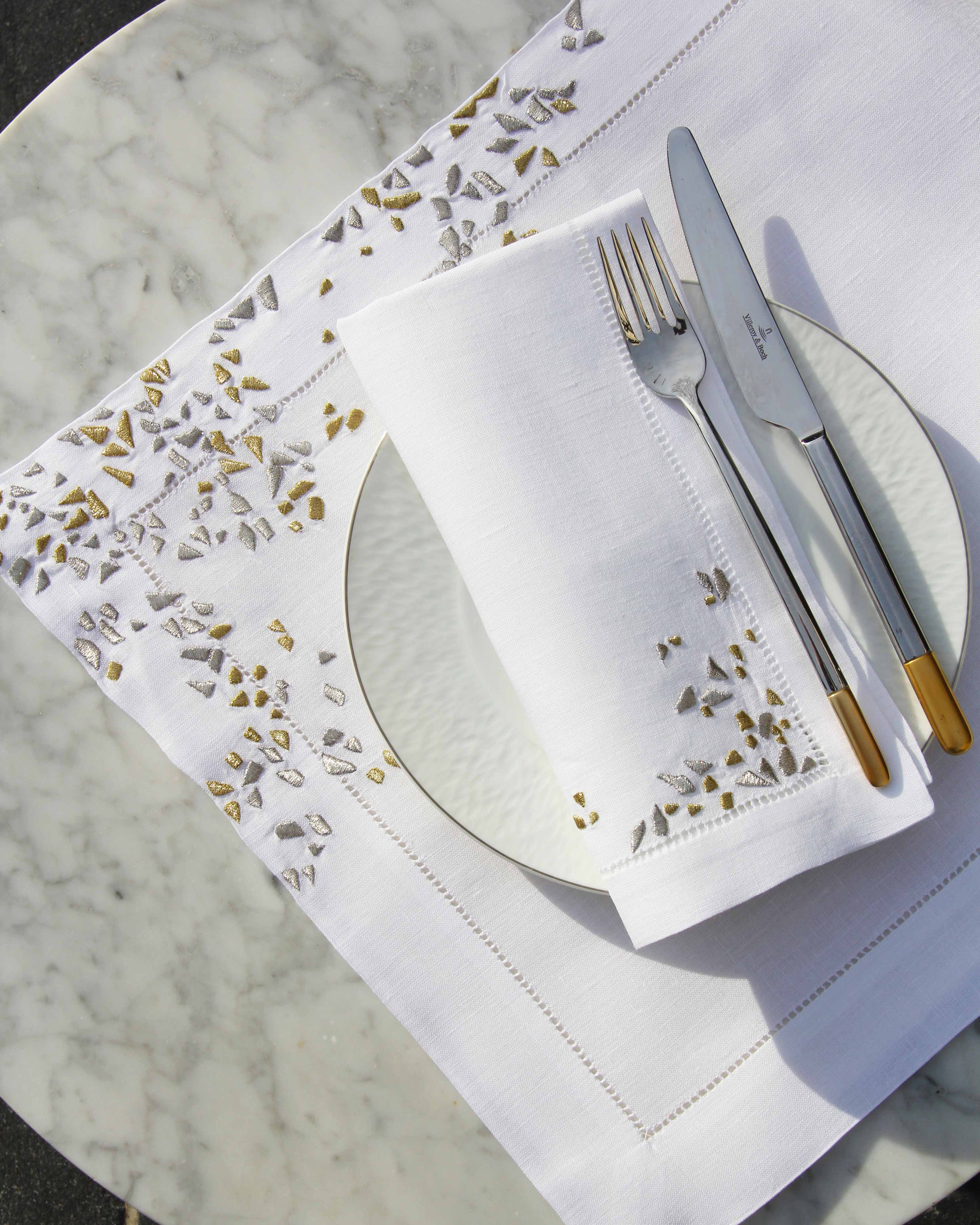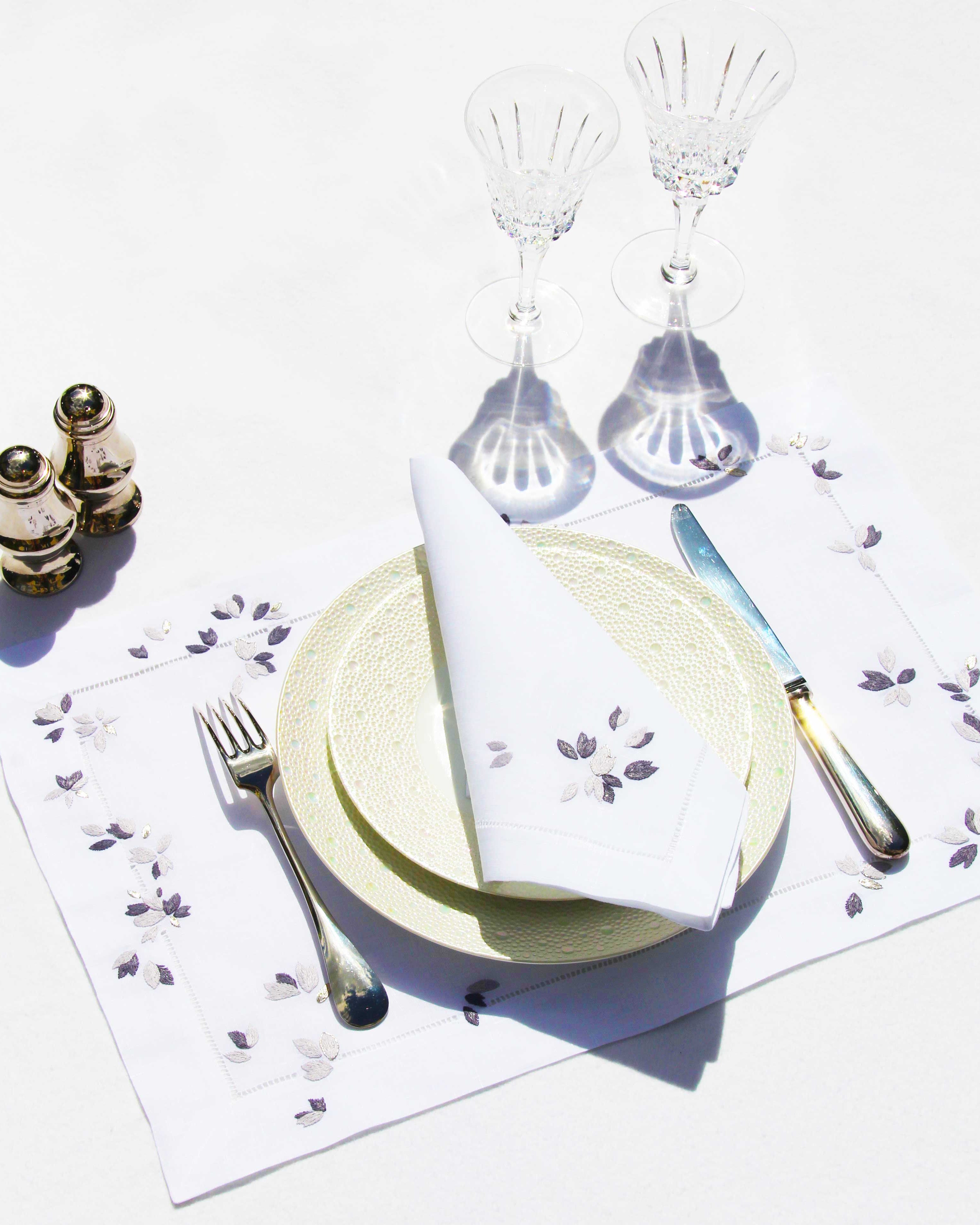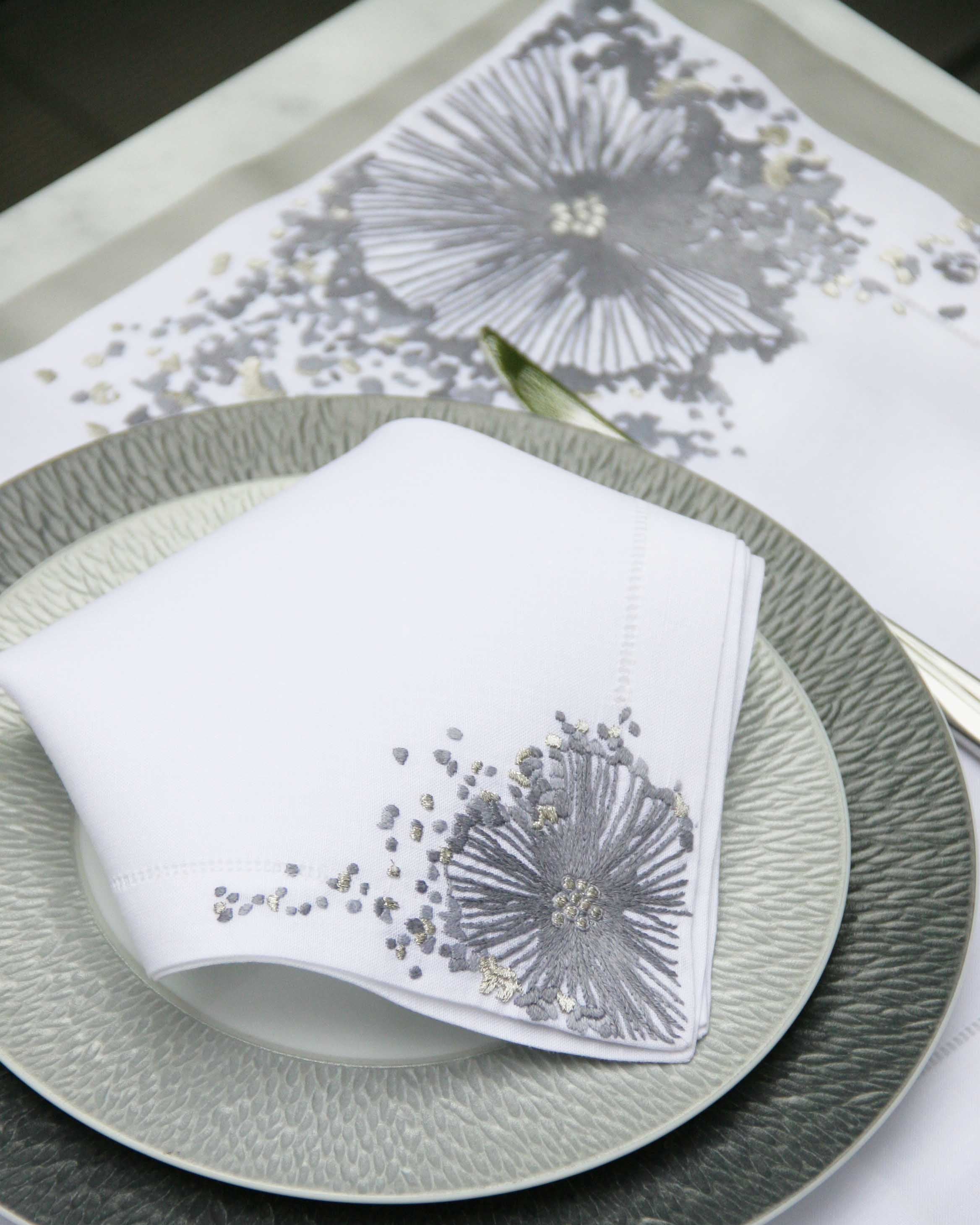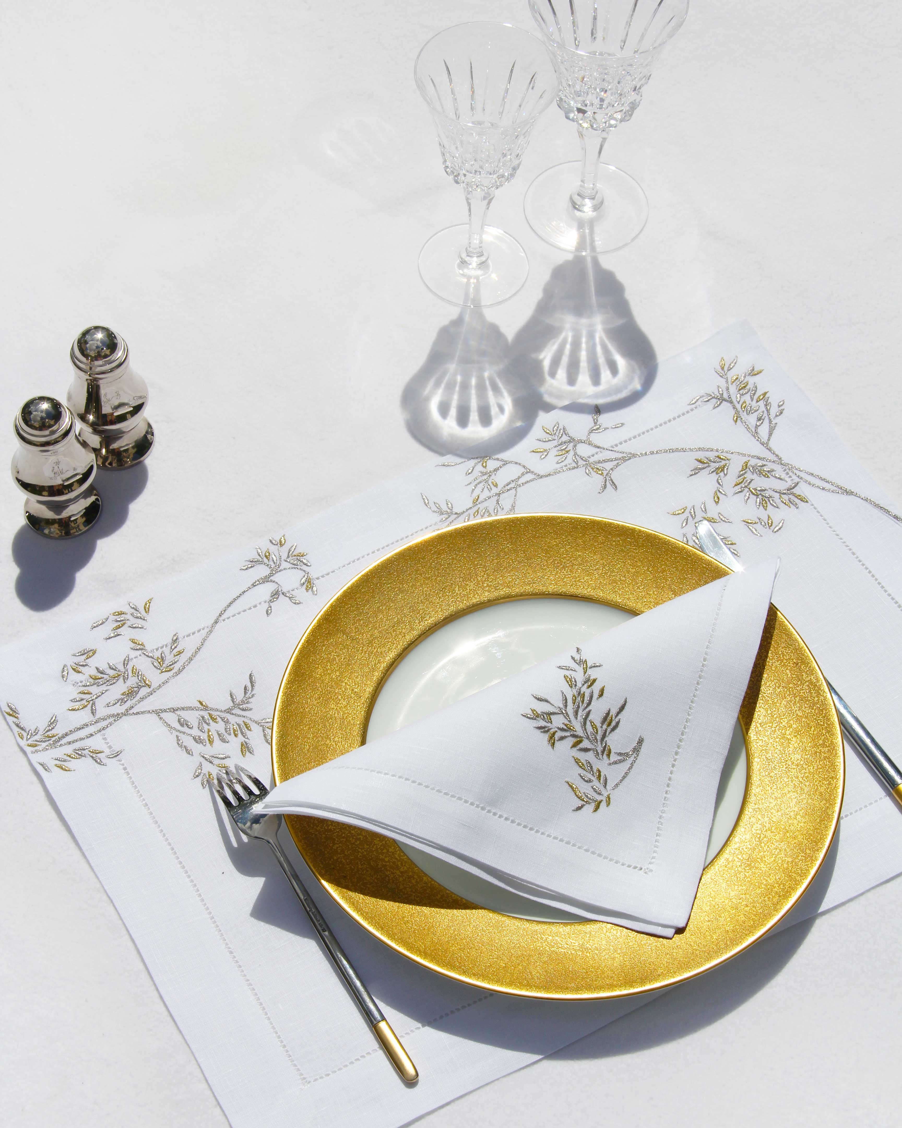 Tissés dans les plus belles matières et brodés à la main dans nos ateliers français, ces éléments témoignent d’une volonté : réinventer le linge de table avec noblesse, exigence et poésie.