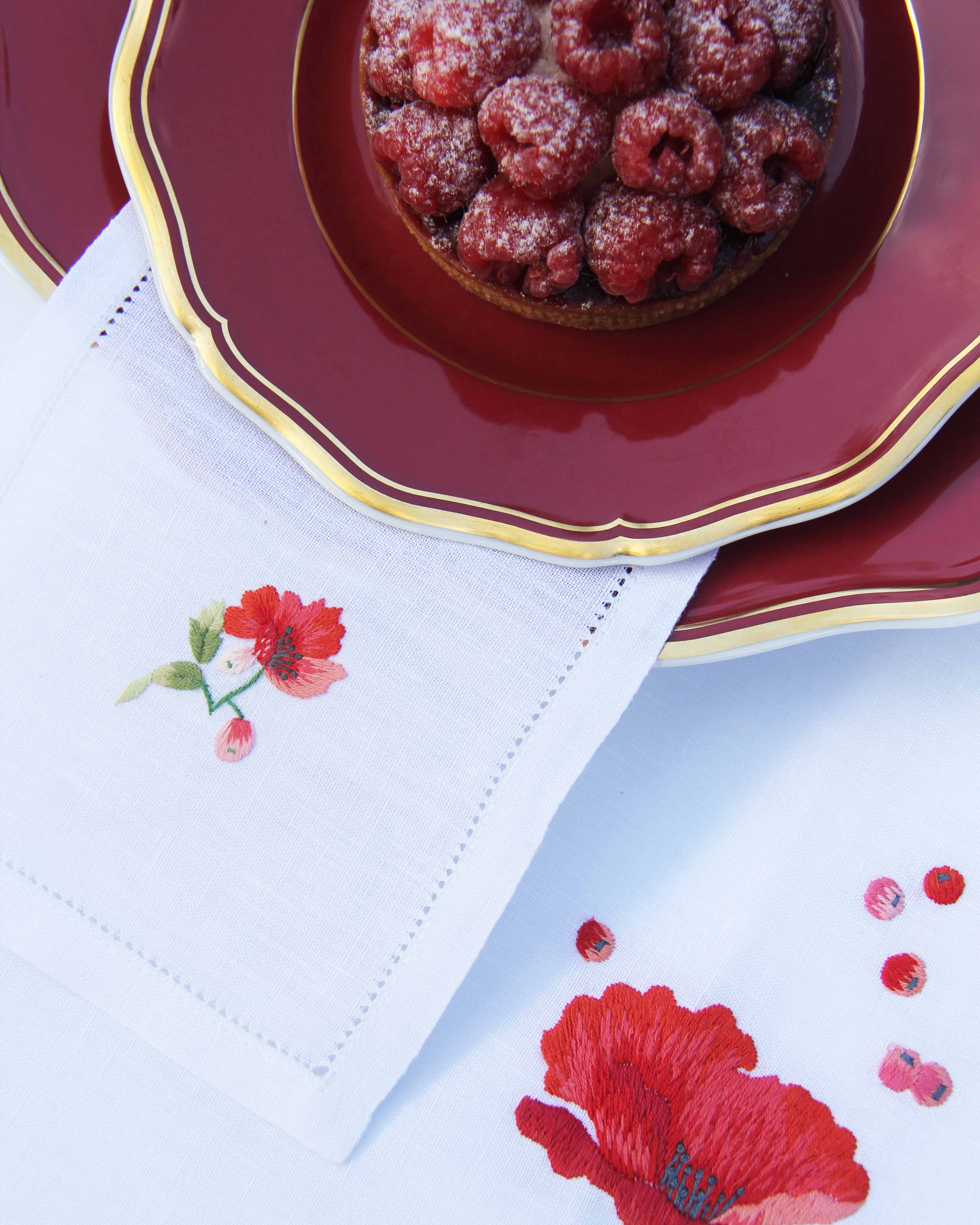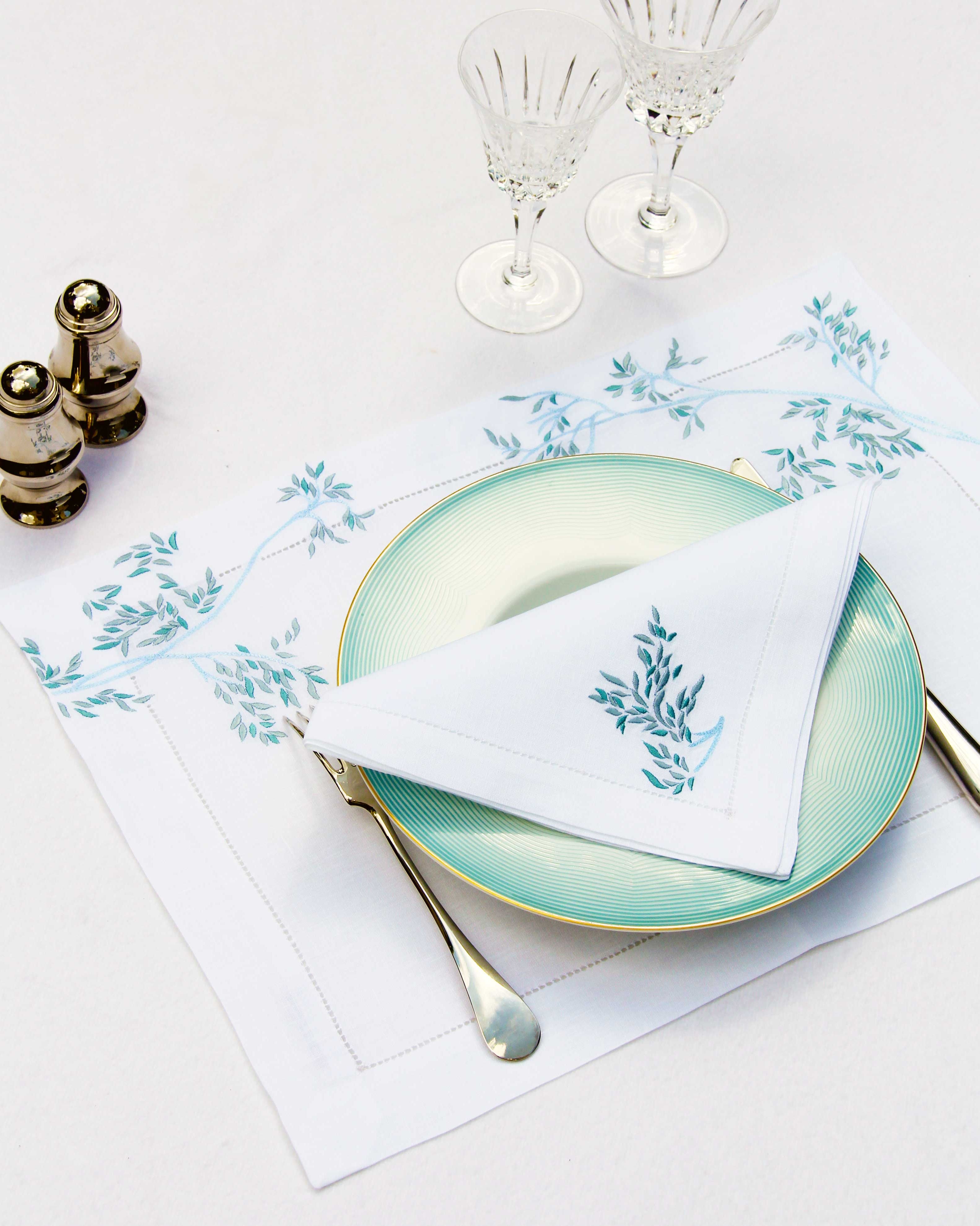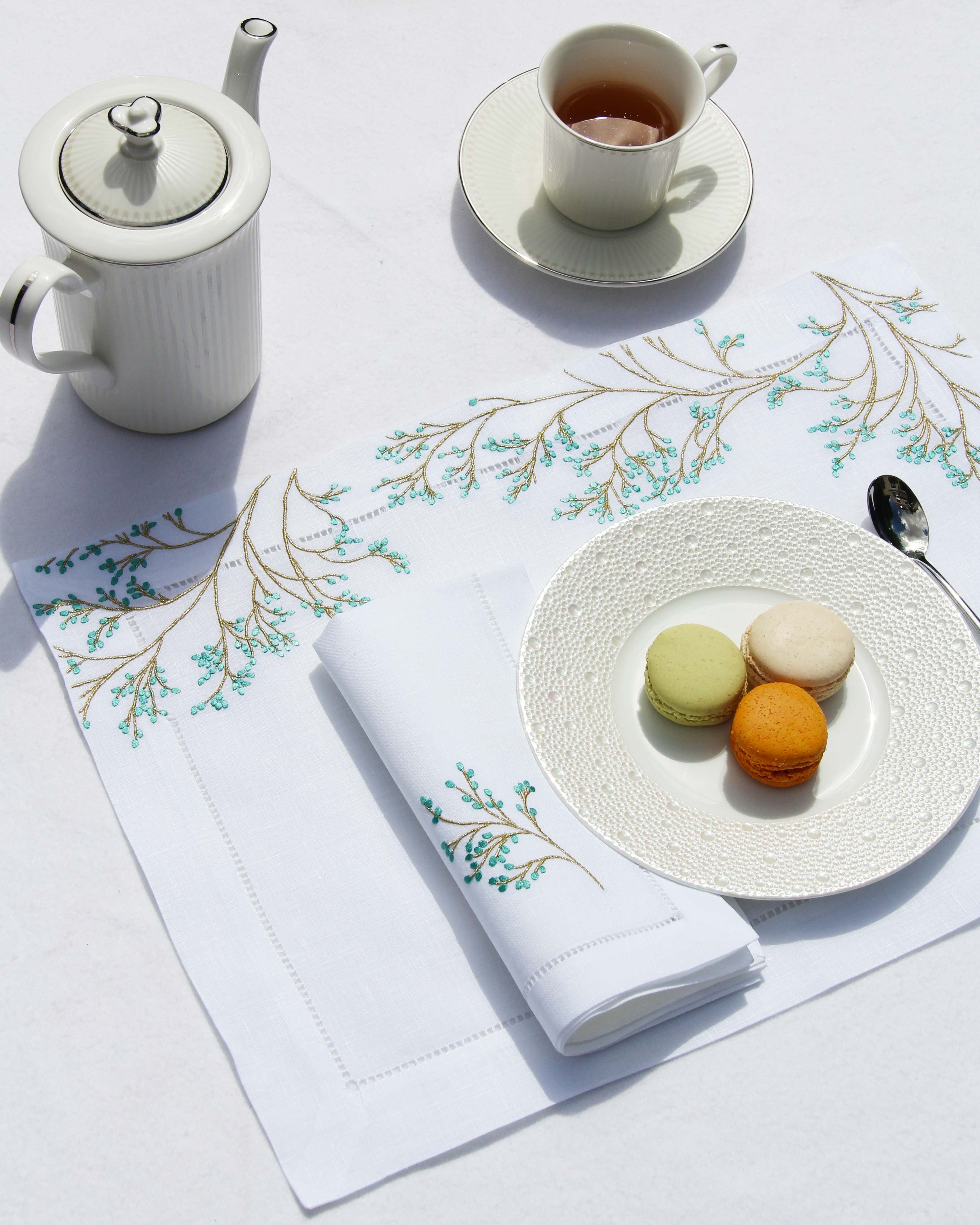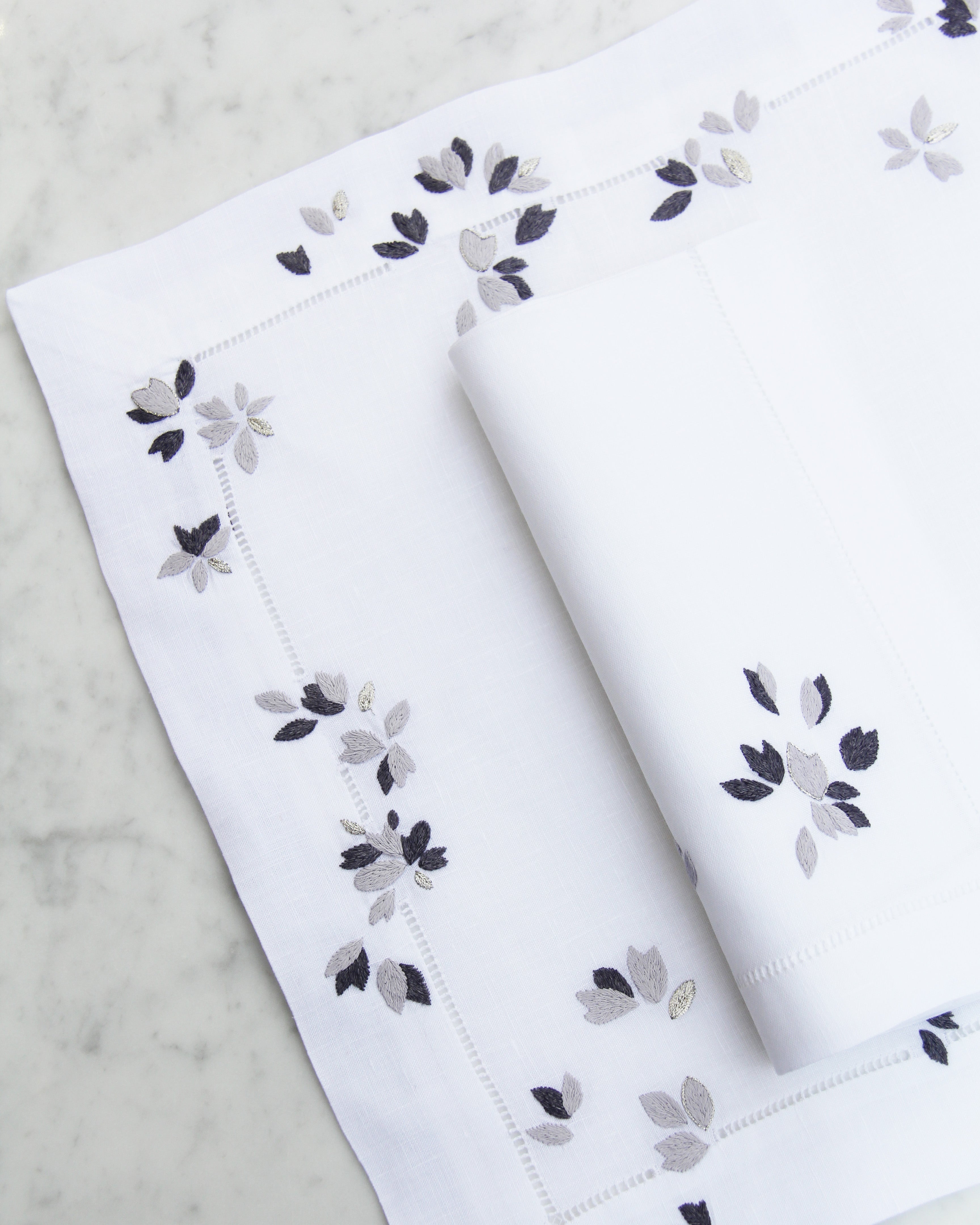 Tissés dans les plus belles matières et brodés à la main dans nos ateliers français, ces éléments témoignent d’une volonté : réinventer le linge de table avec noblesse, exigence et poésie.