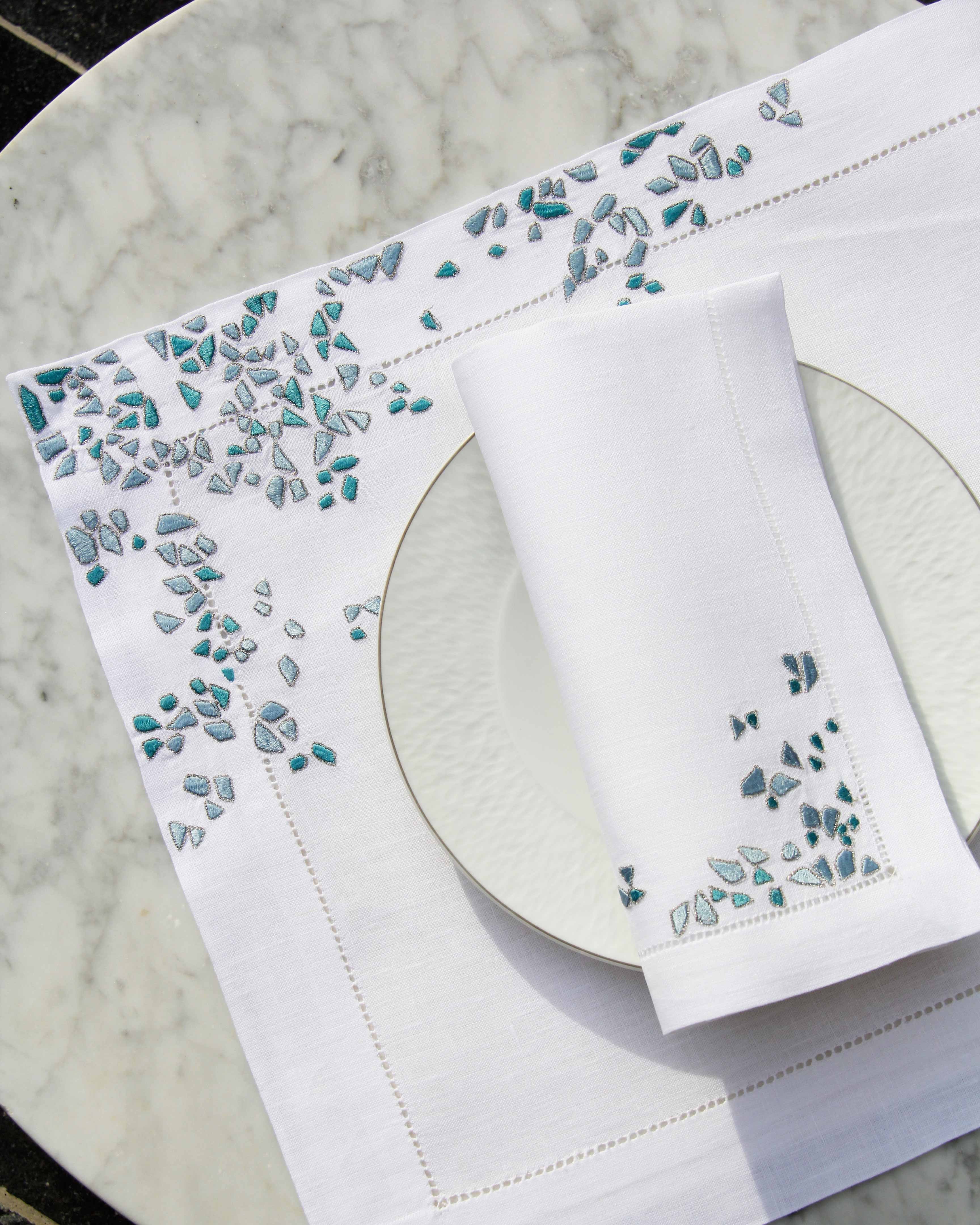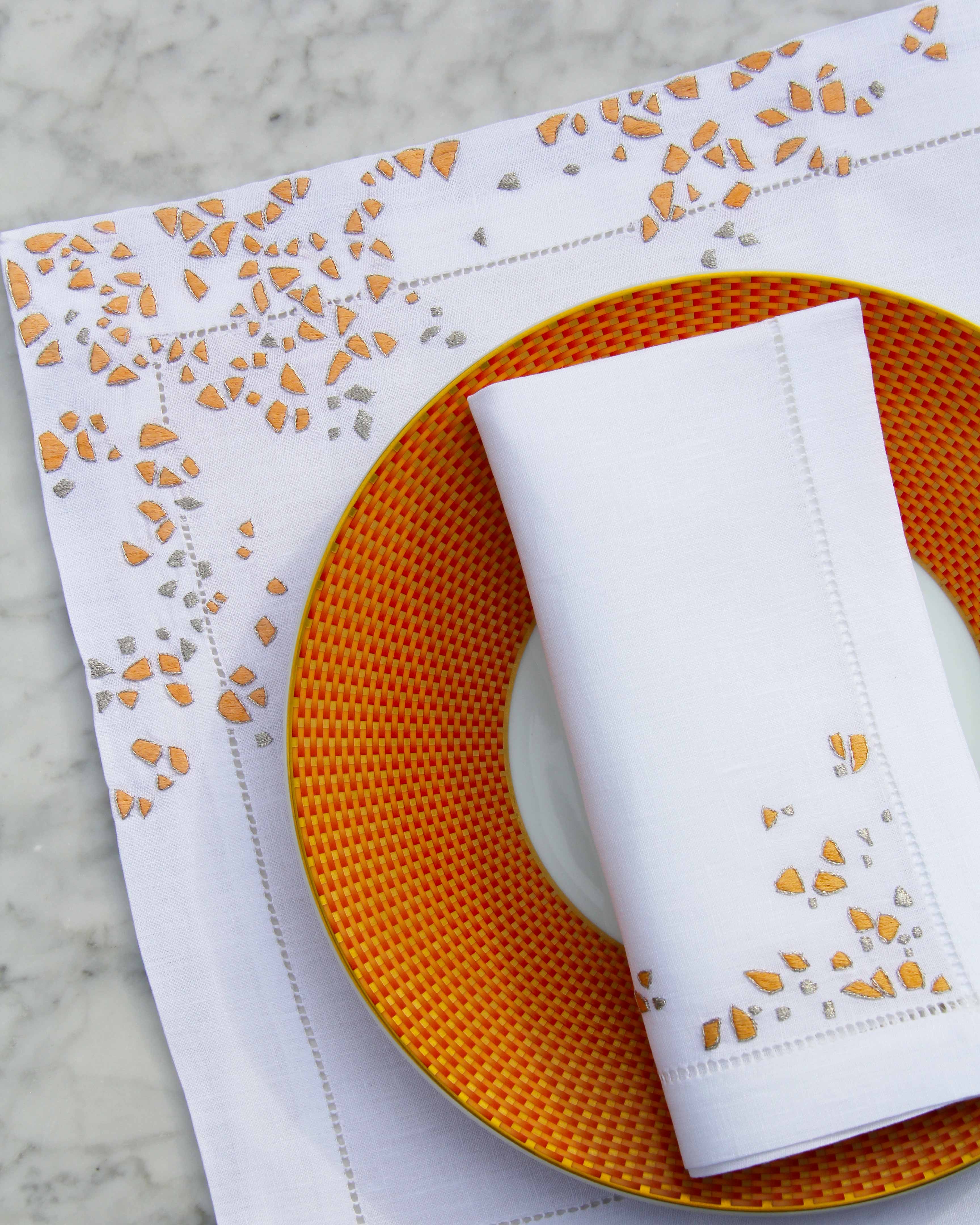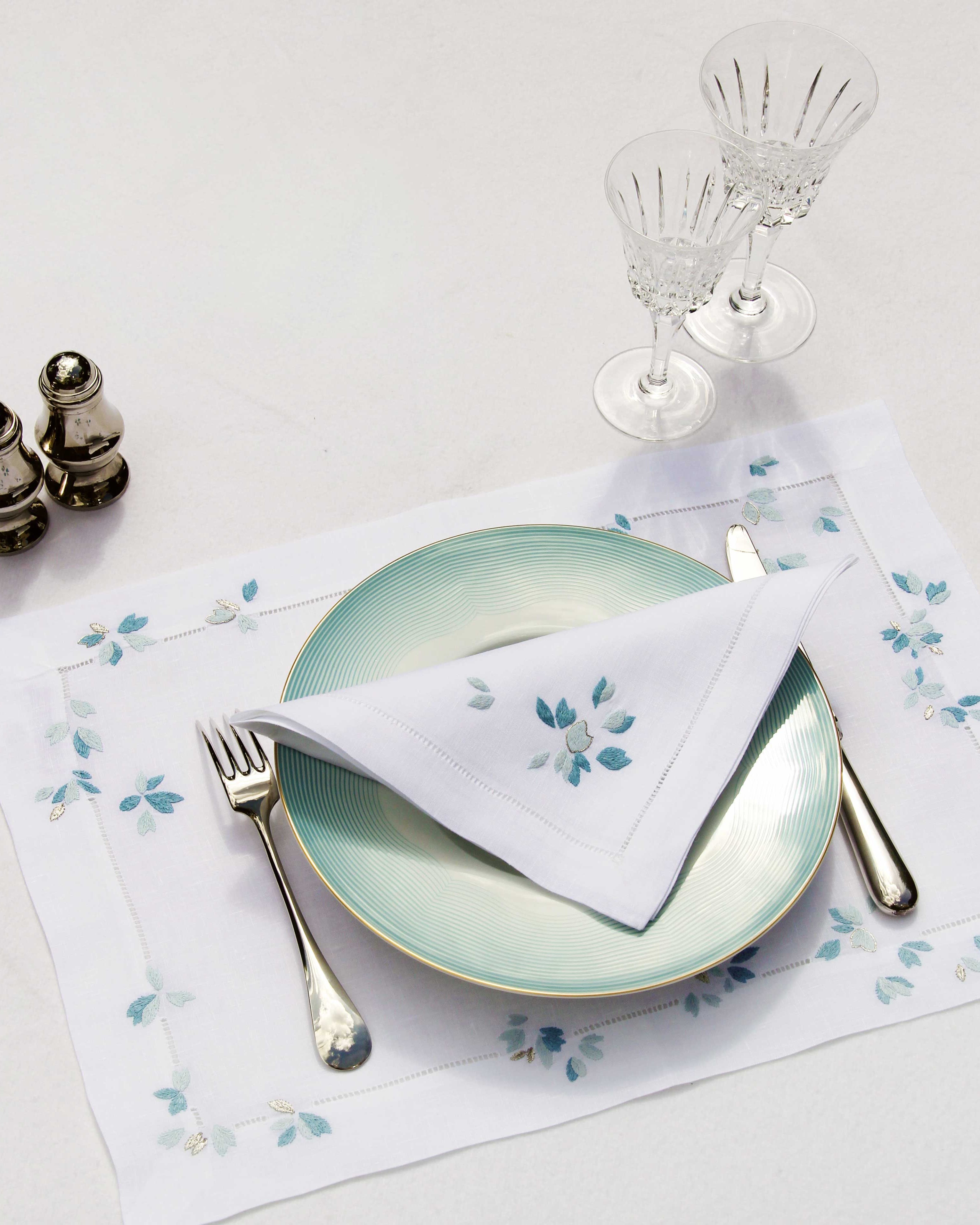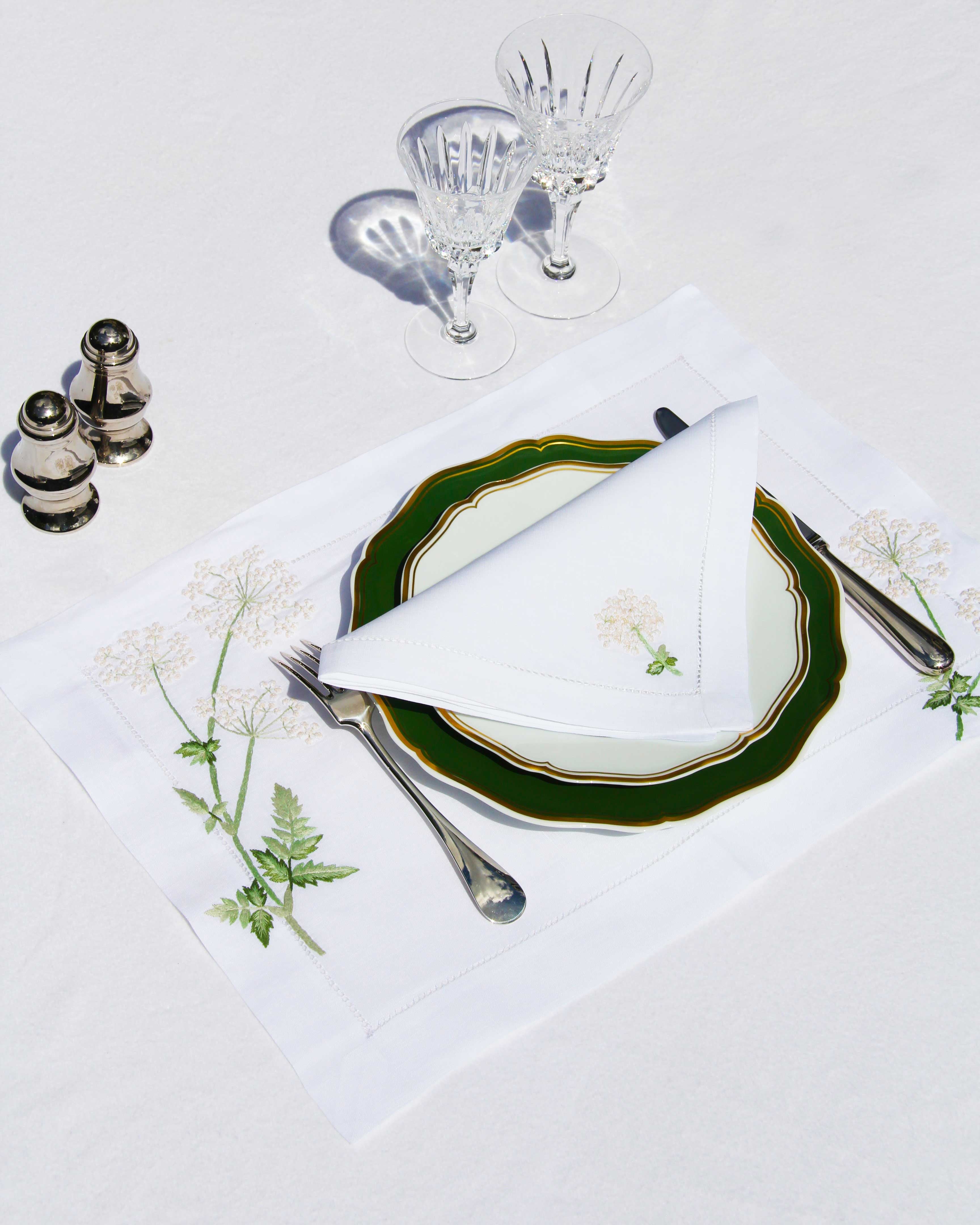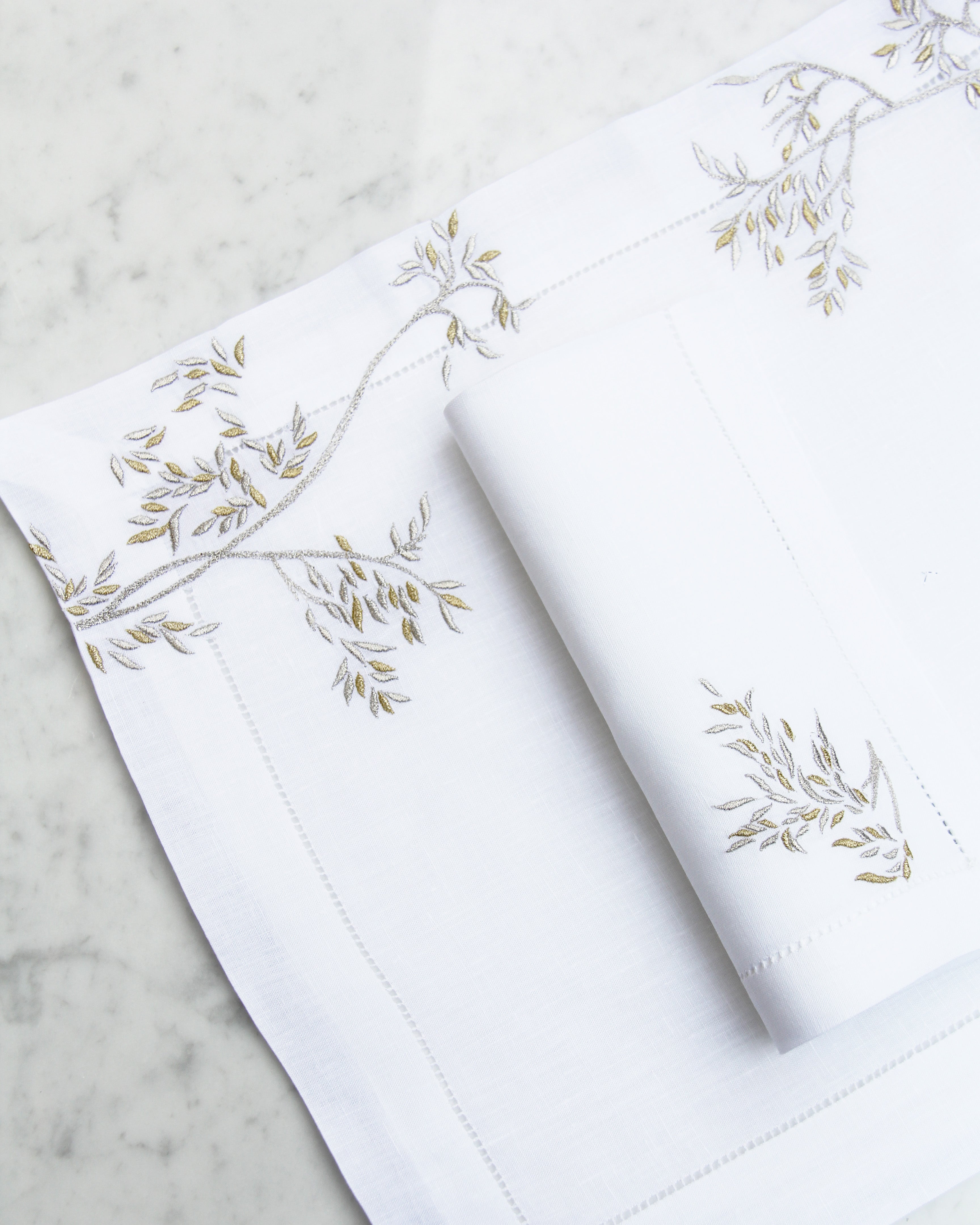 Tissés dans les plus belles matières et brodés à la main dans nos ateliers français, ces éléments témoignent d’une volonté : réinventer le linge de table avec noblesse, exigence et poésie.