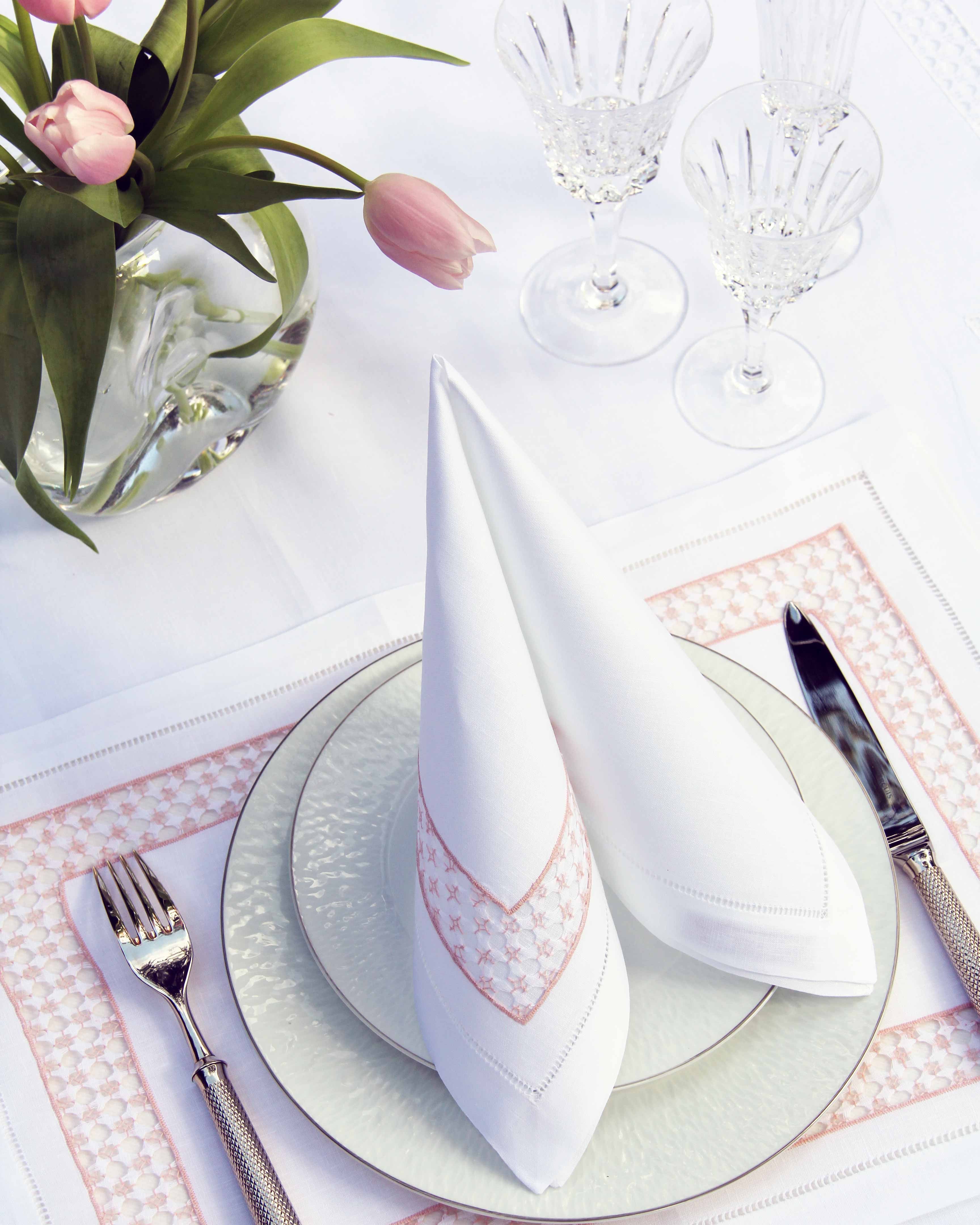 La nappe brodée main devient une toile de fond majestueuse, tandis que les serviettes de table de luxe, les sets de table design et les serviettes cocktail complètent l’ensemble avec subtilité. Toutes nos pièces sont pensées pour s’accorder entre elles, créant une harmonie visuelle aussi belle à regarder qu’agréable à vivre.