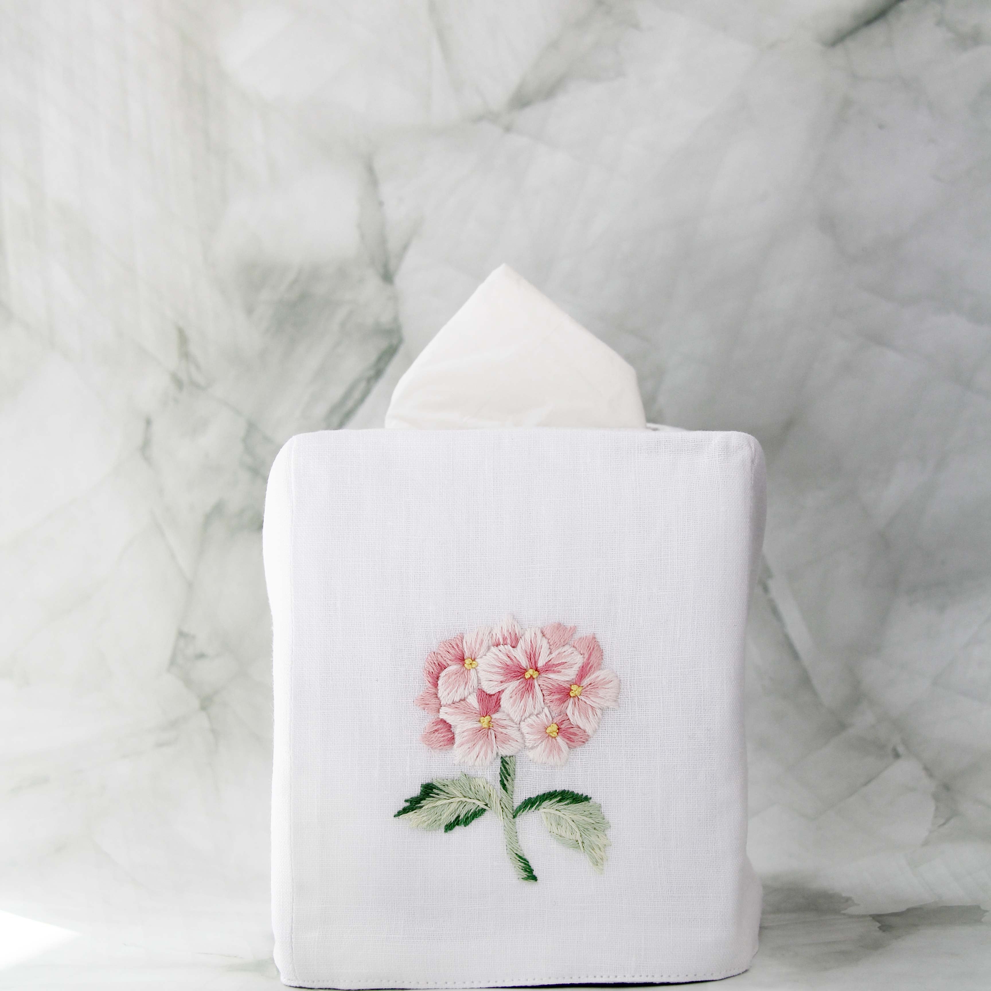 Hortensia pink Linen embroidered Square Tissue Box Cover