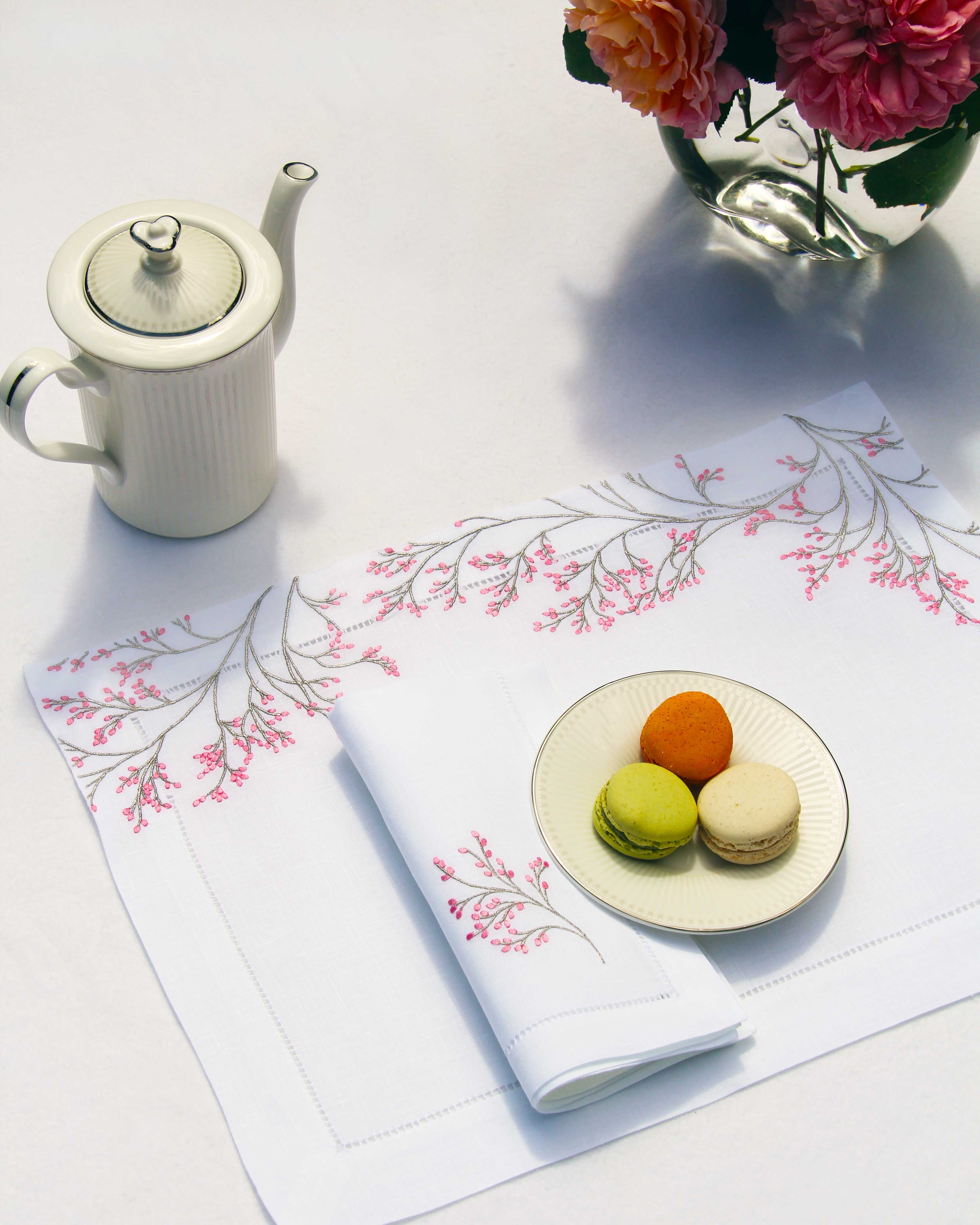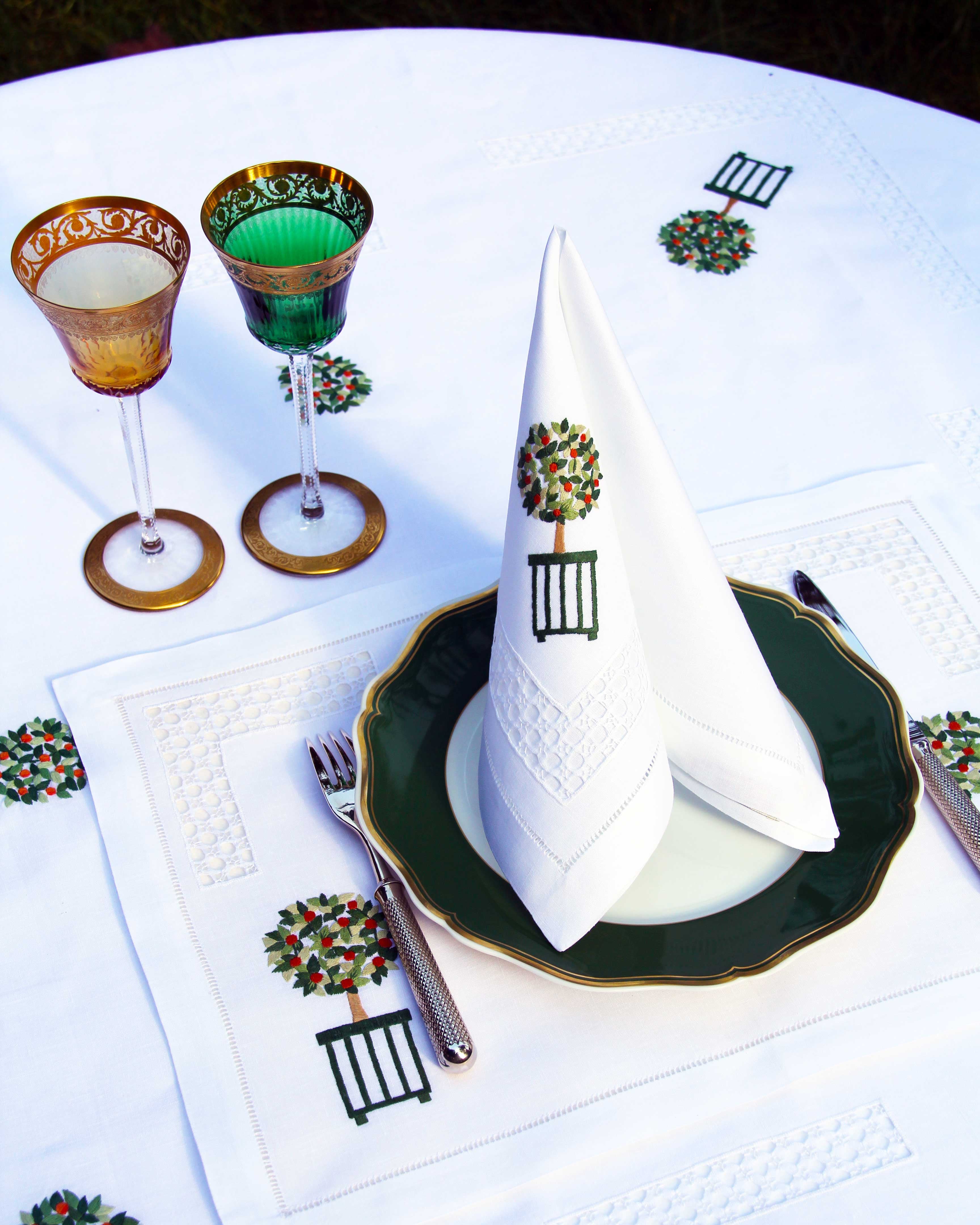 The hand-embroidered tablecloth becomes a Volute Majestueuse backdrop, while the luxury napkins , designer placemats , and cocktail napkins subtly complete the ensemble. All our pieces are designed to coordinate with each other, creating a visual harmony that is as beautiful to look at as it is pleasant to live in.