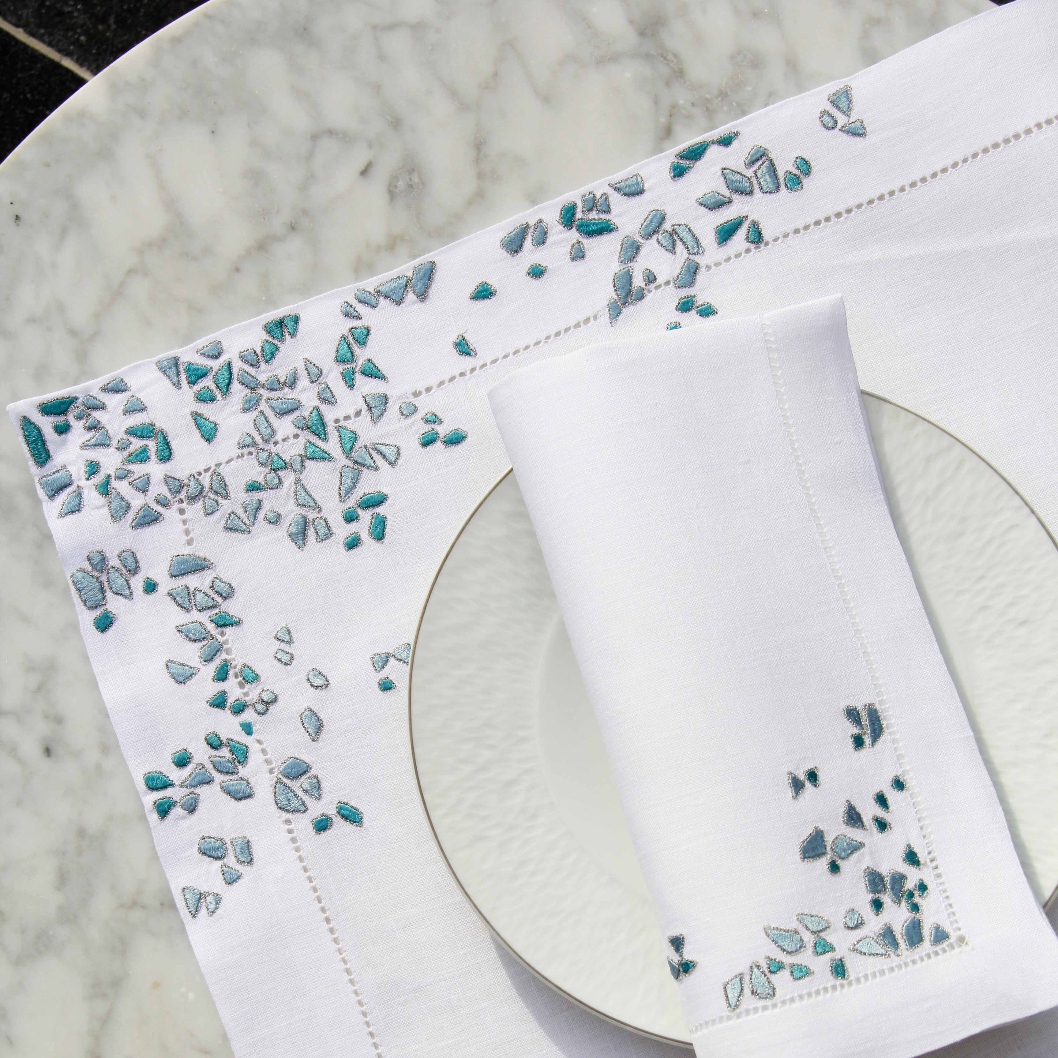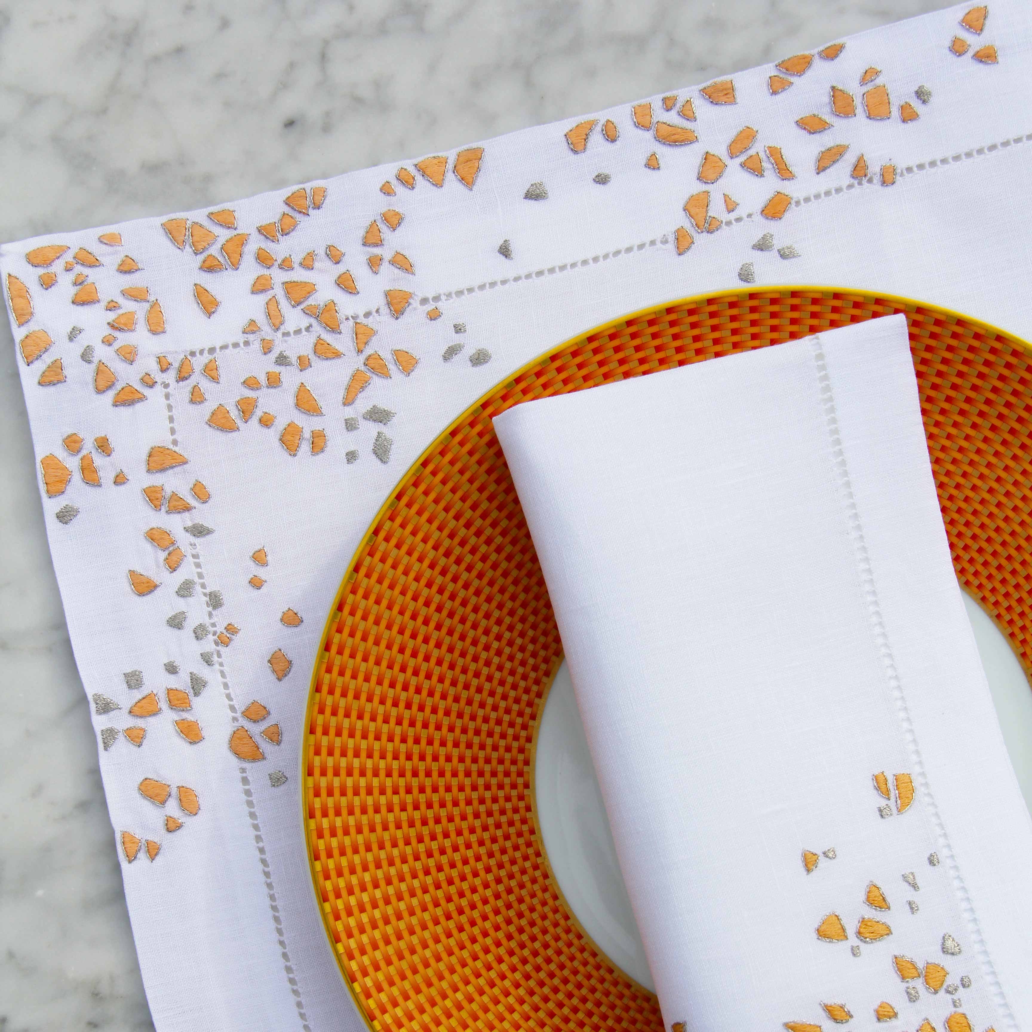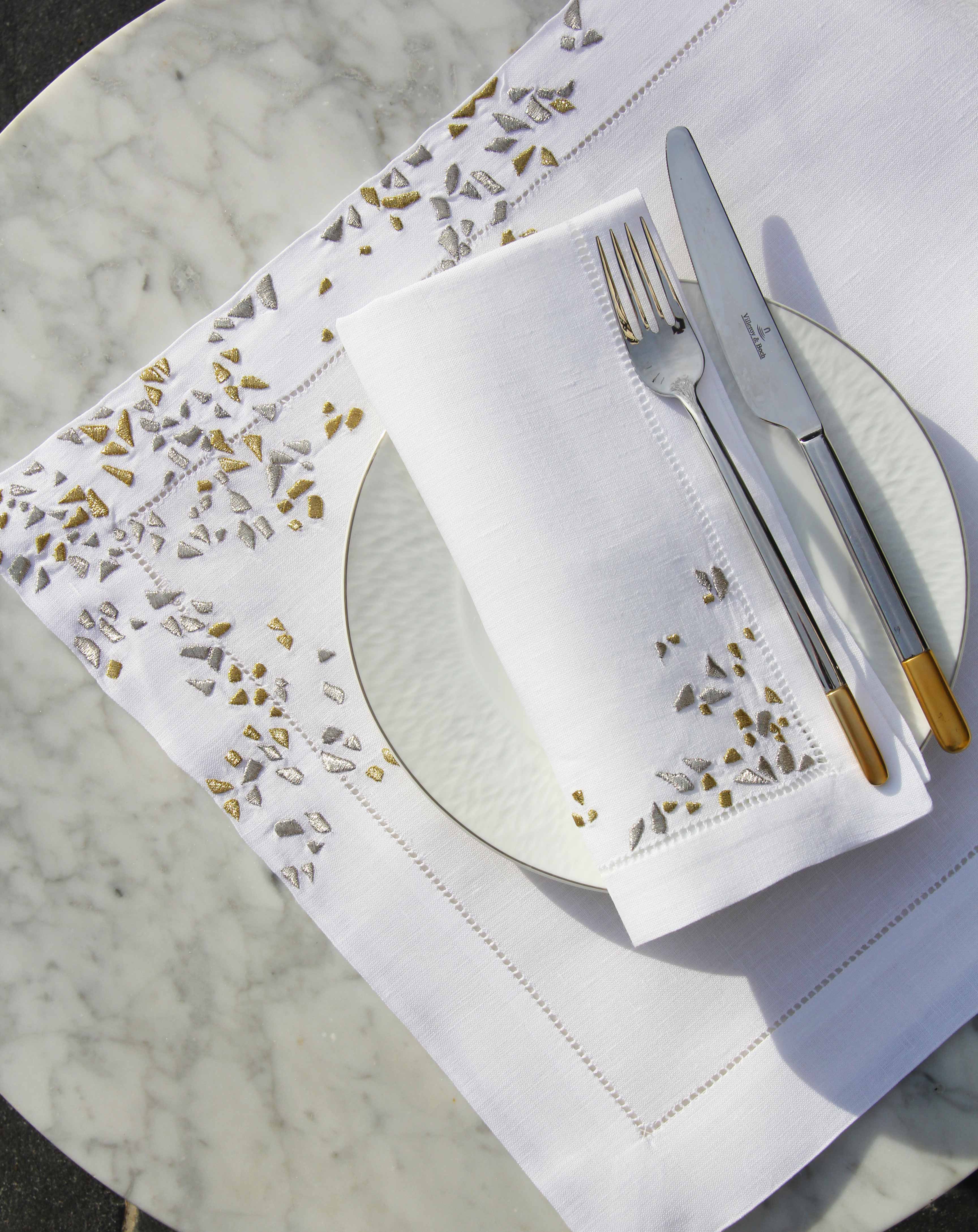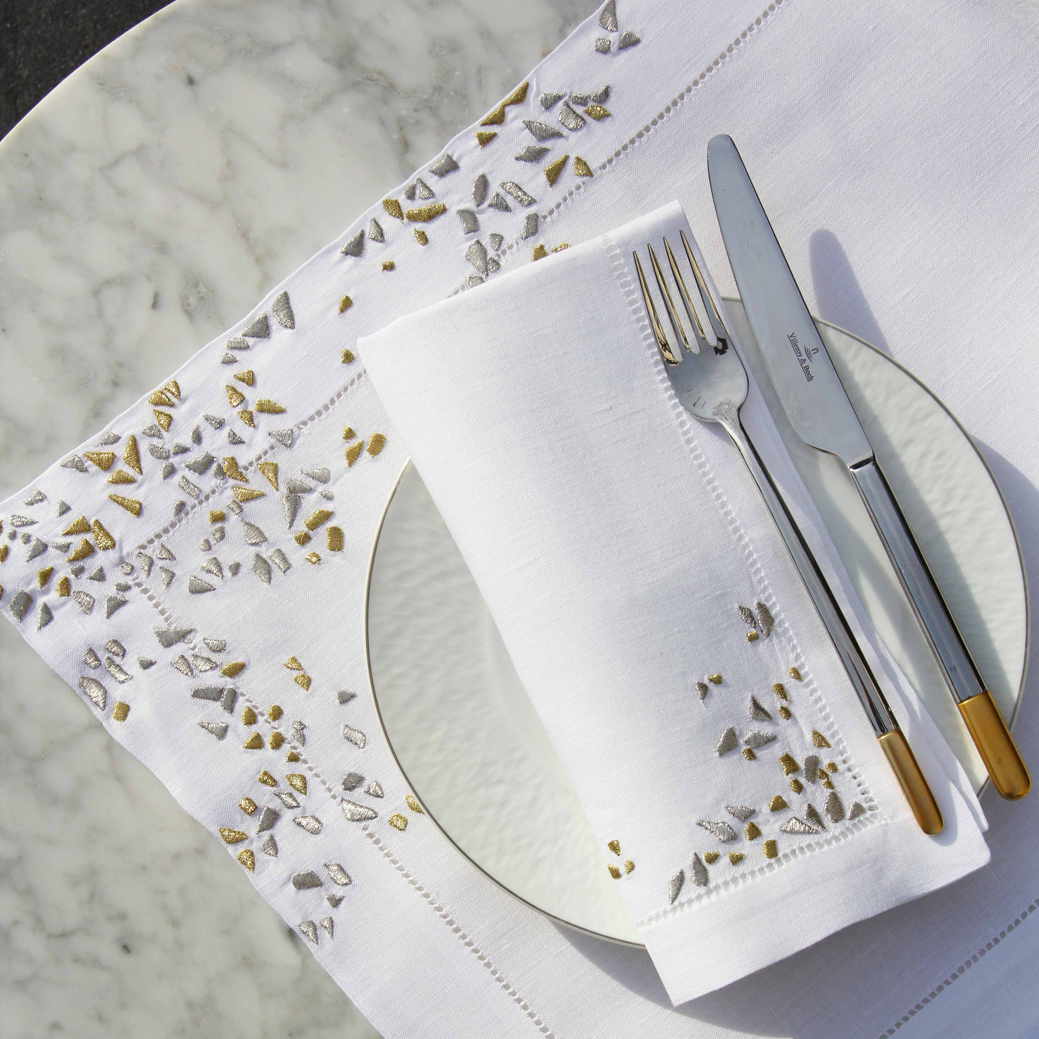 Fragments gold silver Embroidered Linen Placemat and Napkin