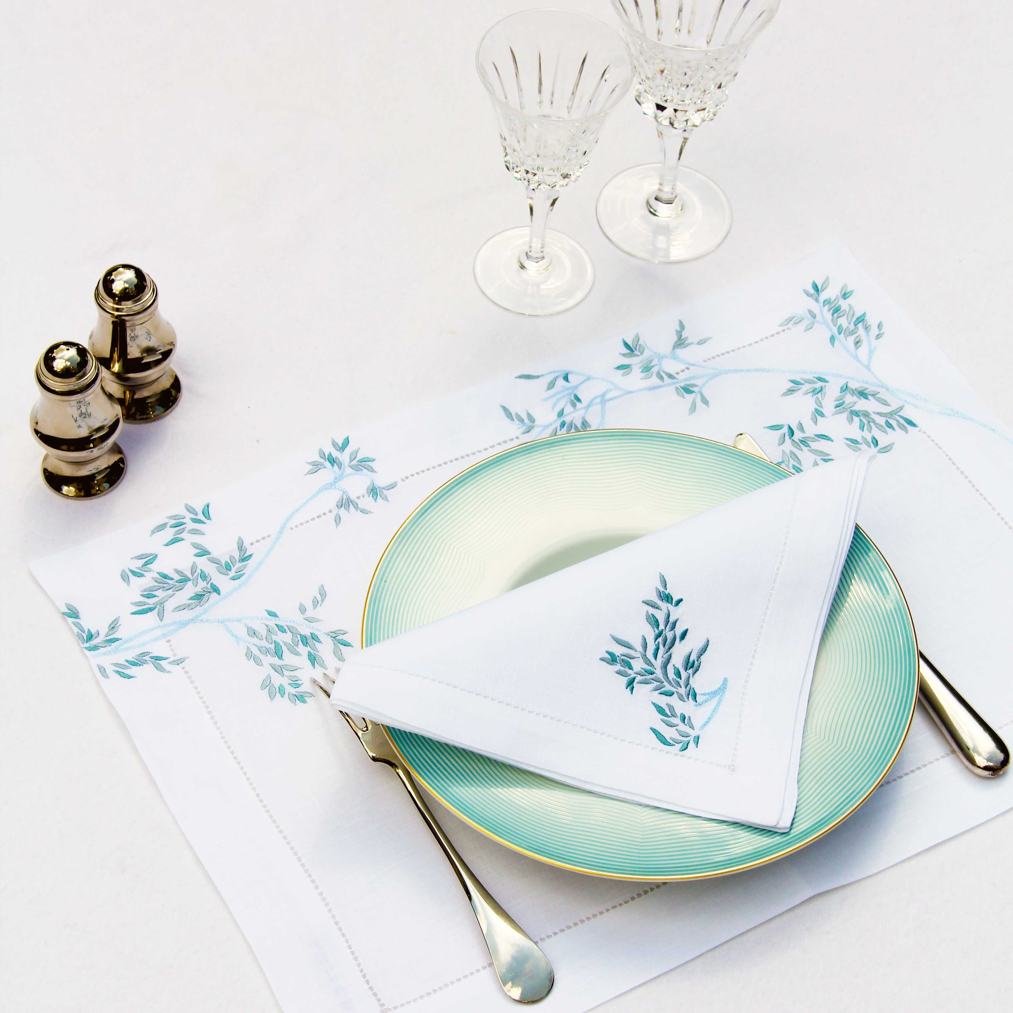 Nagoya blue Embroidered Linen Placemat and Napkin
