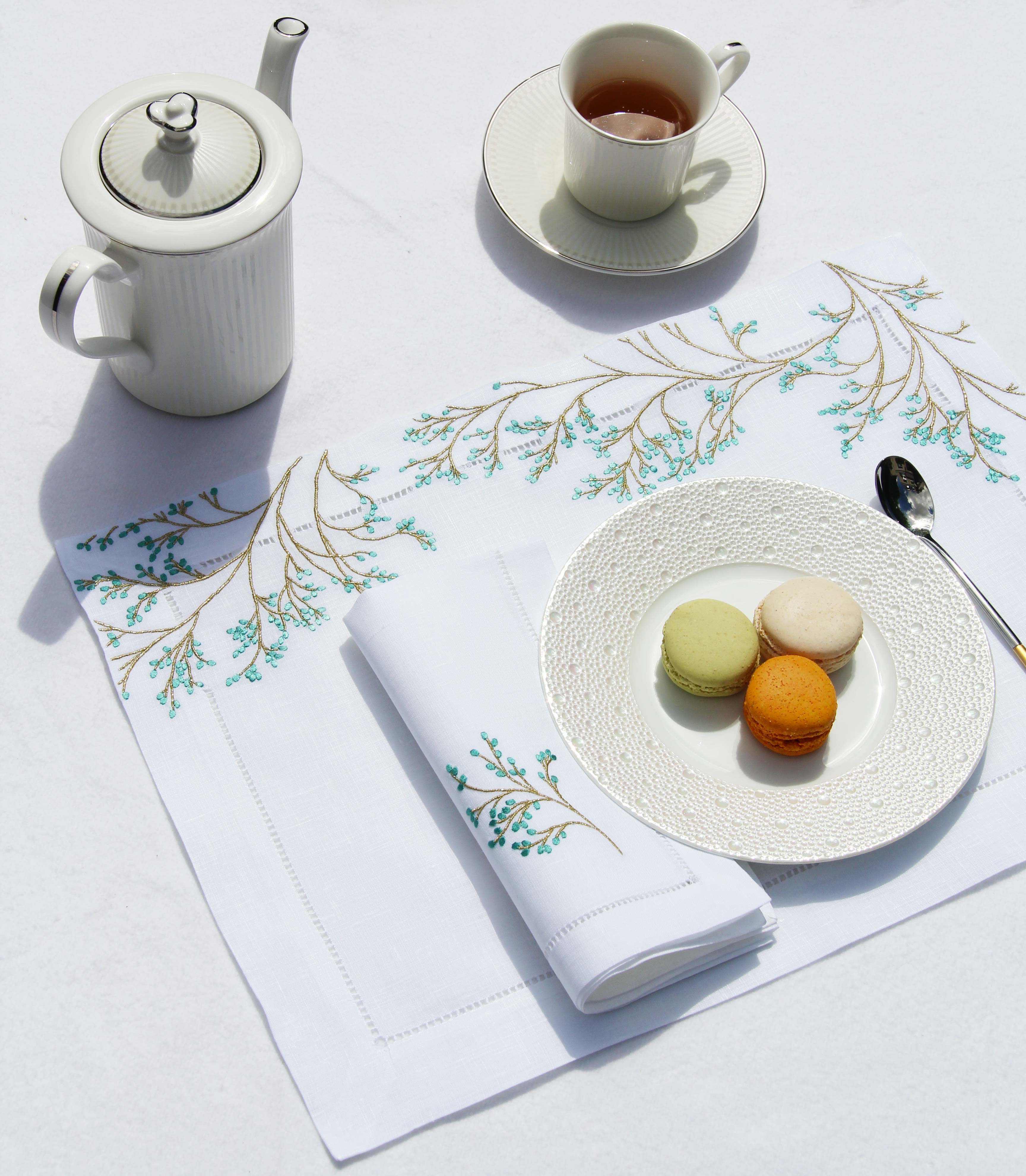 New Graminée turquoise Embroidered Linen Placemat and Napkin